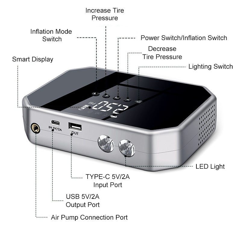 Funzioni del prodotto: Avviamento / Gonfiaggio / Ricarica / Illuminazione