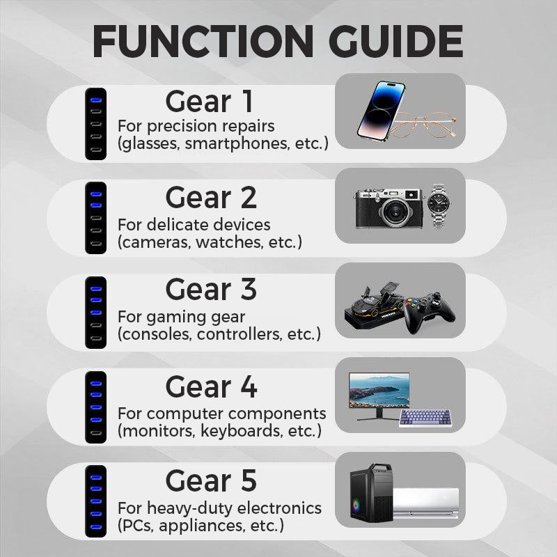 ADATTABILITÀ A 5 VELOCITÀ: Velocità 1: Telefoni | Velocità 2: Orologi, Fotocamere | Velocità 3: Modellini, Console da gioco | Velocità 4: Monitor, Tastiere | Velocità 5: PC, Elettrodomestici. La coppia regolabile garantisce una gestione perfetta per qualsiasi progetto.