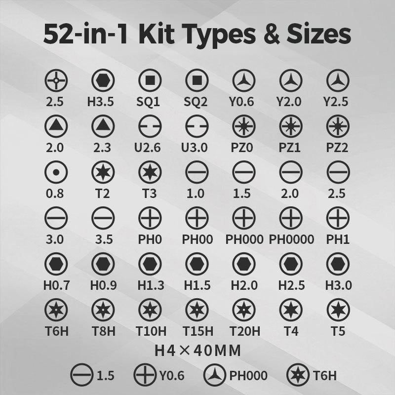 VERSATILITÀ 52-IN-1: Questo kit tutto-in-uno include punte di precisione, ideali per tutto, dall’elettronica delicata agli elettrodomestici più robusti. Che si tratti di riparare smartphone, orologi, fotocamere o persino apparecchi domestici, questo set elimina la necessità di avere più utensili. La selezione organizzata garantisce di avere sempre la punta giusta per ogni lavoro, risparmiando tempo e frustrazione.