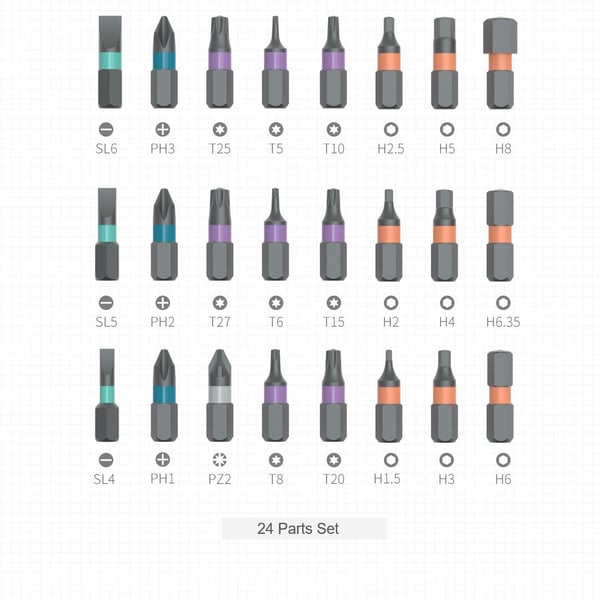 24 punte per cacciavite in acciaio legato al cromo-molibdeno S2 di qualità industriale, trattate termicamente in modo continuo. 5 tipi di teste di cacciavite per soddisfare esigenze professionali, domestiche, progetti fai-da-te e manutenzione. Design a cricchetto da 6,2 gradi, struttura a cricchetto a rotazione positiva e negativa con 58 denti, risparmiando fino all’80% dello sforzo.