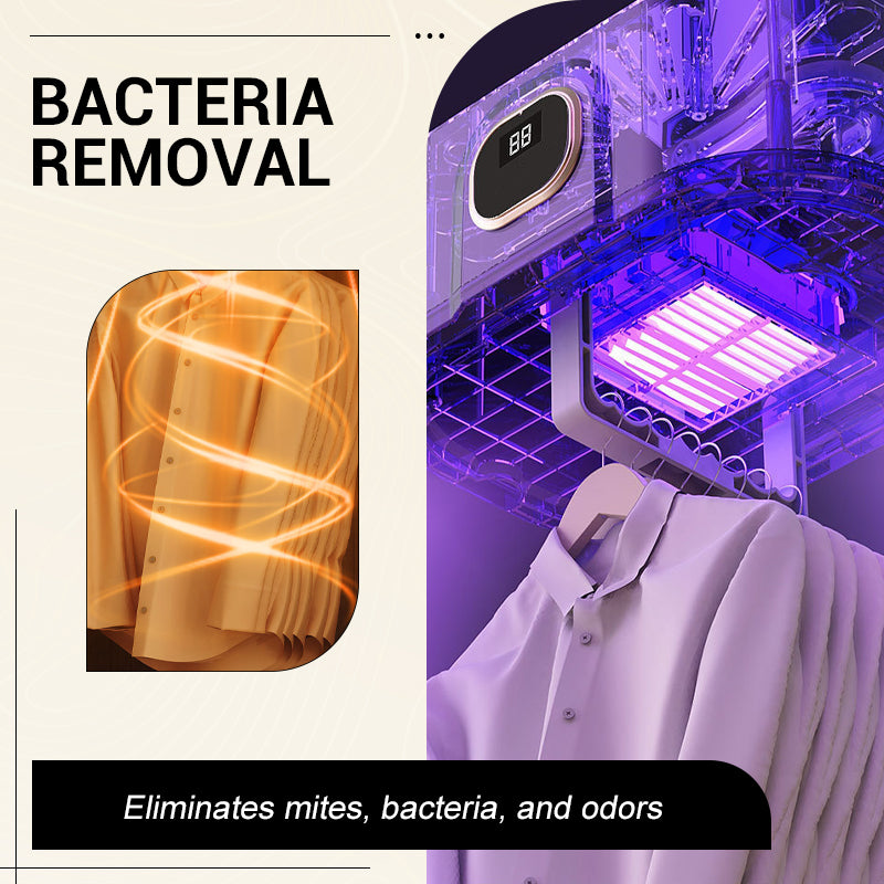 POTERE IGIENIZZANTE – Oltre ad asciugare, l'unità aiuta a mantenere l'igiene. L'aria calda elimina batteri e acari della polvere, mentre la tecnologia a ioni negativi integrata neutralizza gli odori. Questo garantisce che i tuoi vestiti non solo escano asciutti, ma anche igienicamente sicuri e profumati.
