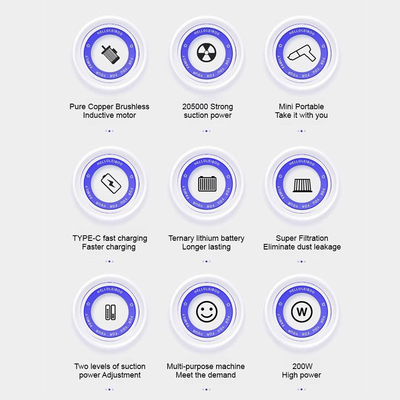 Il pacchetto include: 1* Potente aspirapolvere portatile multifunzionale, 1* Ugello Lungo, 1* Ugello a Spazzola, 1* Cavo di Ricarica, Manuale, Asciugacapelli