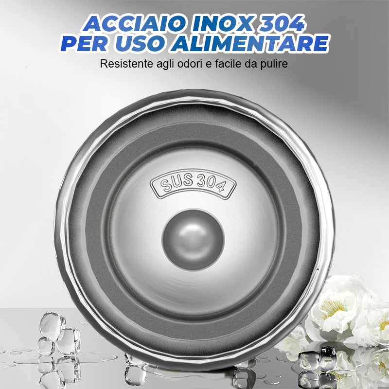 INTERNO IN ACCIAIO INOX ALIMENTARE 304: Realizzata con acciaio inox 304 di alta qualità, la parte interna resiste agli odori e alle macchie, garantendo un gusto puro a ogni utilizzo. La superficie liscia permette una pulizia semplice e veloce.