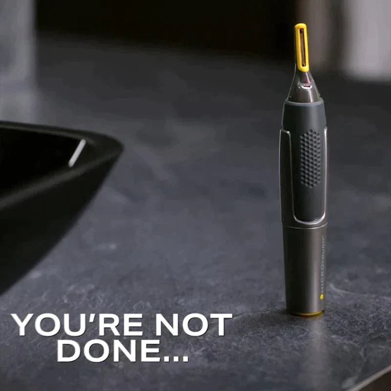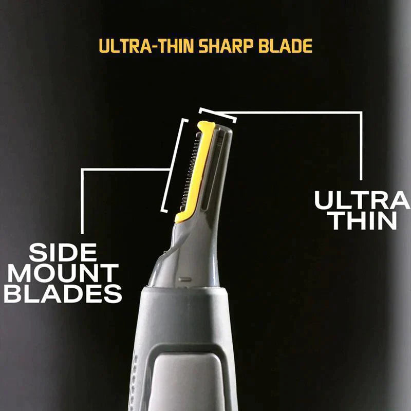 Il nuovissimo rifinitore di micro-precisione ha una testina ultrasottile con lame montate lateralmente perfettamente angolate, che vanno oltre dove tagliacapelli e forbici possono. Ora, con lame in acciaio inossidabile tedesco micro-oscillanti, legate con titanio, ti rendono diverso .