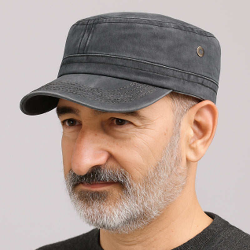 ASPETTO ROBUSTO, FASCINO SENZA TEMPO - Esprimi la tua autorità con questo cappellino dalla corona piatta ispirato al design militare. Le linee nette e la silhouette strutturata conferiscono uno stile audace e deciso. È la fusione perfetta tra la praticità classica e il fascino moderno.