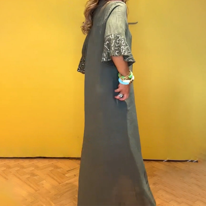 DETTAGLI LUCENTI IN PAILLETTES – Abito camicia con bottoni, arricchito da dettagli in paillette su maniche, orlo e tasche sul petto, per un tocco chic e glamour nel tuo guardaroba quotidiano.